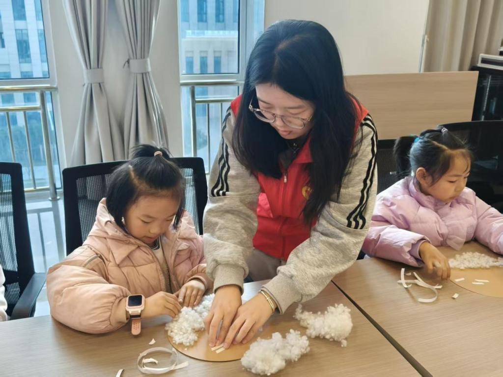 活动伊始,主讲人以生动通俗的语言,为小朋友们讲解小雪节气的由来——作为二十四节气中第二十个节气,小雪标志着气温进一步下降、降水渐增的气候转折;同时借助“冬腊风腌”“晒腊肠”“吃糍粑”等传统习俗故事传递民俗文化,让孩子们直观感受节气与生活的紧密联系。此外,主讲人还带领小朋友们品读《小雪》《小雪日戏题绝句》《夜泊荆溪》等经典诗词,深化对节气文化的认知,在朗朗书声中传递节气文化的诗意与韵味。在手工实践环节,志愿者们提前准备好画纸、颜料、棉花、彩泥等材料,耐心指导小朋友们创作雪景画。孩子们充分发挥想象力,用画笔勾勒冬日场景,以棉花点缀“雪花”,用彩泥捏制可爱雪人,现场充满欢声笑语。