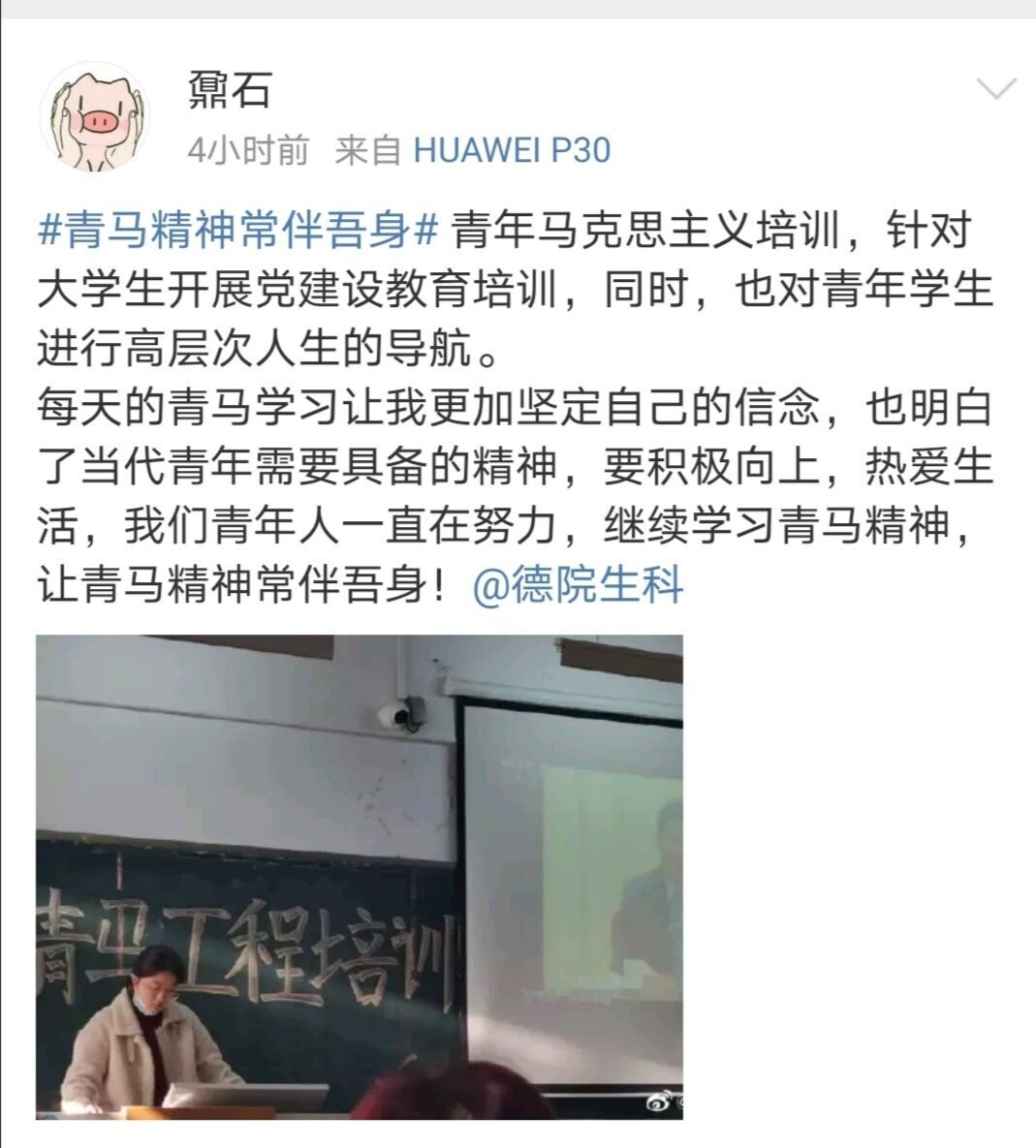 以青年马克思主义培训工作为契机,为进一步引导青马班学院树立积极践行社会主义核心价值观的理念,2020年12月1日至12日期间,365上市公司青马班学员借助微博平台发起以“青马精神常伴吾身”为主题的微博互动活动。