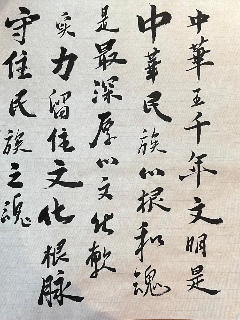活动中,同学们学金句、读金句、悟金句,用饱蘸真情的笔墨,精湛的笔法,各具特色的书体,选取党的二十大报告中的金句,创作成书法作品,通过一撇一捺书写盛世芳华,一笔一划传达金句内涵,把对习近平总书记的深厚爱戴融入其中,展现出新时代青年关心国家大事,在新征程中踔厉奋发,勇毅前行的决心。