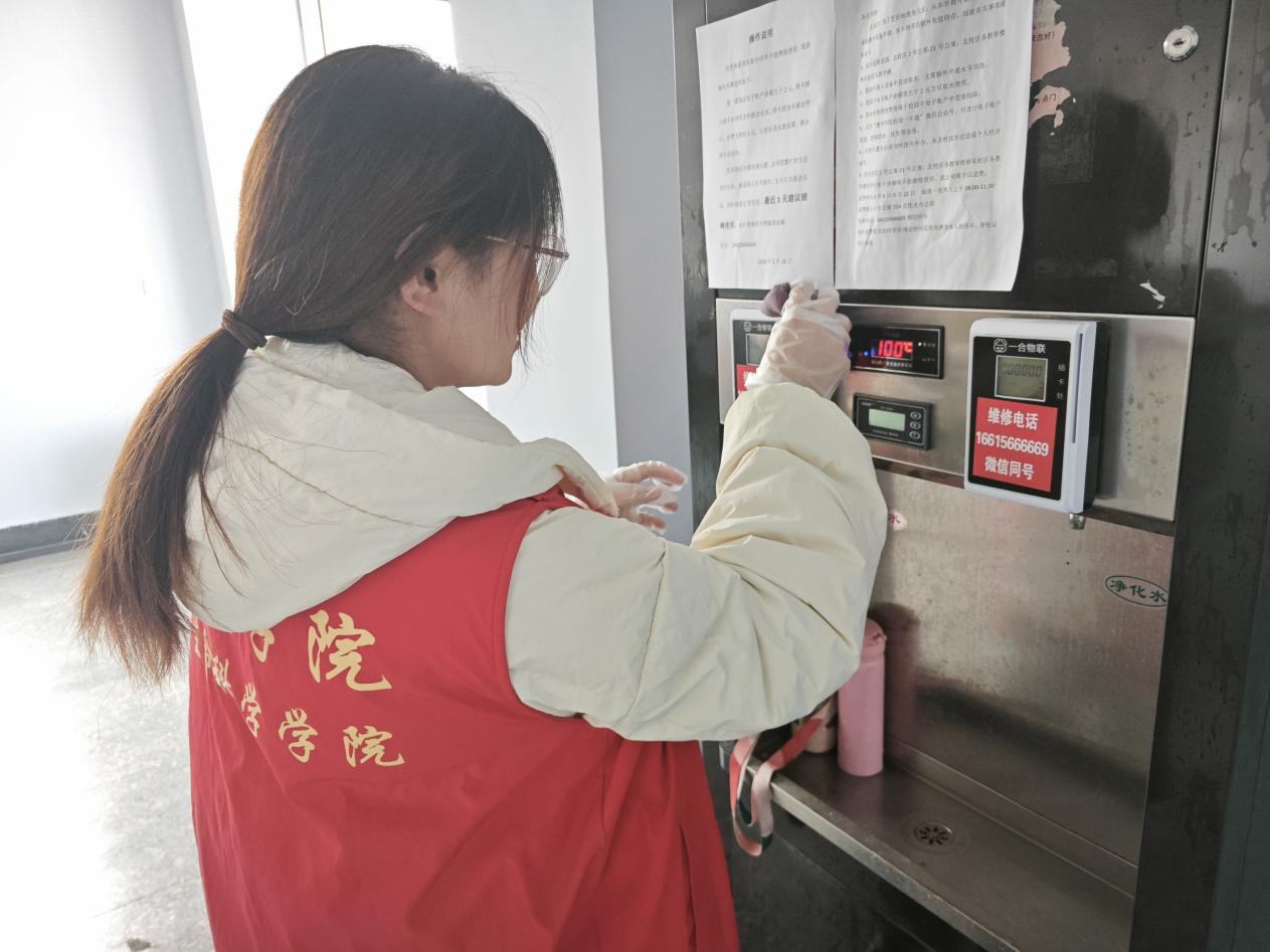 活动中,志愿者们认真准备了清洁工具,在听取了任务分工后迅速投入到行动中。在每层楼的饮水机旁,都可以看到志愿者们认真负责、全身心投入的身影。他们细致地检查每一层的饮水机,对水槽内的茶叶、柠檬片等残渣进行清理的同时做了消毒处理。此外,志愿者还对每个饮水机的外壳进行了擦拭,确保在外观上干净整洁。在大家的团结协作下,饮水机清理工作保质高效的完成,焕然一新的饮水机为师生们营造了良好的饮水环境。