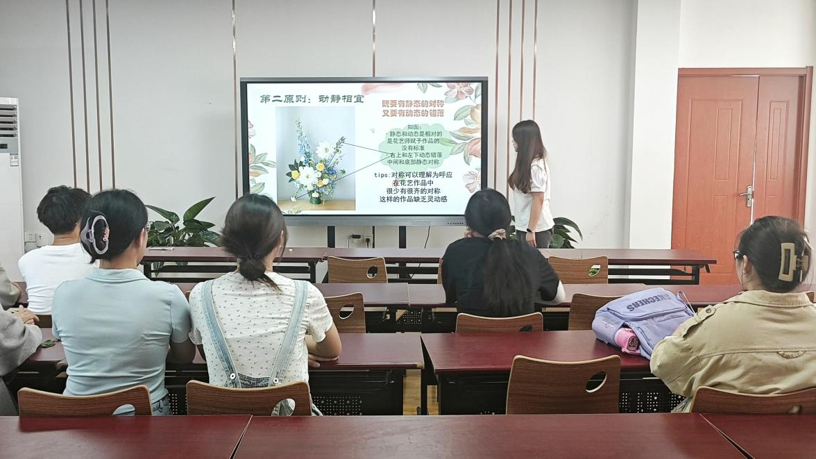 活动中,主讲人首先向大家介绍了插花的起源、发展及其在中国传统文化中的重要地位,使同学们对插花艺术有了更深入的了解。同时,她详细讲解了插花的基本技巧和方法,并通过现场演示,让同学们更加直观地了解了插花的实际操作过程。随后,同学们选取了自己心仪的花卉,结合插花技巧提示,相互讨论插花工艺、插花形式及色调搭配。各式各样的鲜花经过同学们的修剪、组合和自我创造,成为了一件件错落有致、富有创意的艺术品。