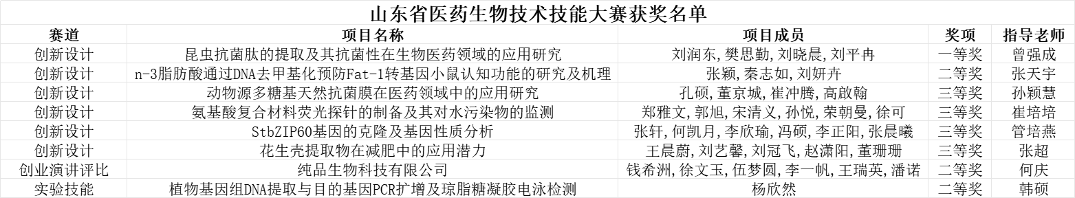 我校学生最终荣获实验技能赛道二等奖1项;创新赛道一等奖1项、二等奖1项、三等奖4 项;创业赛道二等奖1项的优异成绩。此次大赛的成功举办,不仅为大学生提供了一个展示自我、交流学习的平台,也进一步促进了各高校之间在生物医药类专业教学、科研和创新创业方面的交流与合作,同时也为推动山东省生物医药产业的创新发展注入了新的活力。