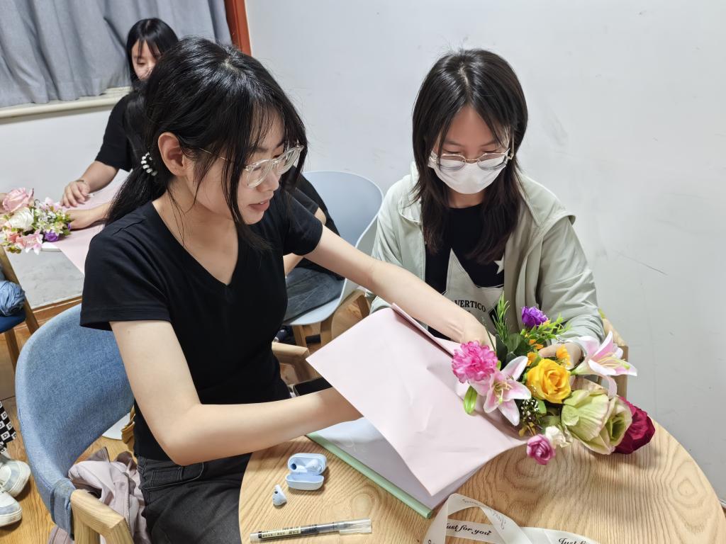 活动现场,主讲人陈泓宇化身“花艺导师”,从色彩搭配原理、包装纸力学结构等专业角度,解析花束包装中的美学逻辑与实用技巧。他分享了不同花材特性及适配包装方案,结合空间构图学指导造型设计。在实践环节,大家挑选玫瑰、满天星等花材,运用所学知识,经层次叠搭、丝带编织、造型调整,将零散花材变成精美花束。无论是利用渐变色营造梦幻感,还是以不对称设计彰显个性的作品都饱含创作者的巧思与匠心。