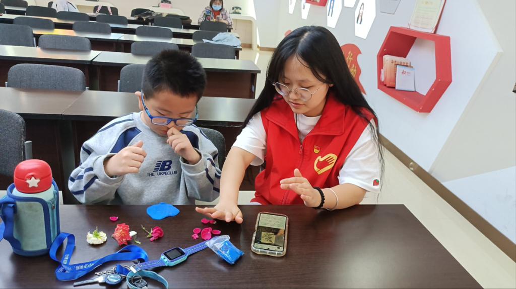 (党员志愿者指导孩子们做化石标本)