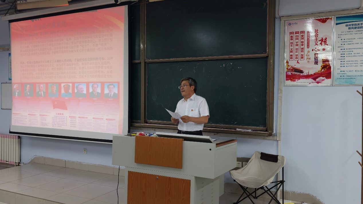 会议伊始,党委书记赵庆福同志向全体学员介绍了本期培训的课程设置和学时安排,并作“端正入党动机,争取早日加入党组织”主题讲座。他强调全体学员要端正入党动机,认真学好党的理论知识,注重学习实效,做到知行合一。随后,赵书记表示全体学员要以党员的标准严格要求自己,坚定共产主义信念,自觉接受党的考验,尽早的成为一个立场坚定、忠诚于党的事业的先锋战士。最后,赵书记希望全体学员充分认识开展培训的重要性,把习近平新时代中国特色社会主义思想转化为坚定理想、锤炼党性、指导实践、推动学习的强大力量,以实际行动争取早日加入中国共产党。