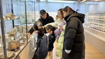 启智楼标本馆内,丰富的动植物标本有序陈列、保存完好,宛如一座“移动的自然博物馆”。专业讲解员围绕标本展开系统科普,从动植物的起源分布、演化脉络,到独特的生存特性与生态角色,用生动形象的表述层层解析。小学生们紧跟讲解节奏,不时驻足观察标本的形态特征,认真记录知识点,面对新奇的标本满眼好奇,积极参与问答互动,在近距离观察中直观感受生物多样性的神奇。家长们也全程陪伴,与孩子共同探讨自然奥秘,现场亲子互动与学习氛围交织,让科普研学更具温度。