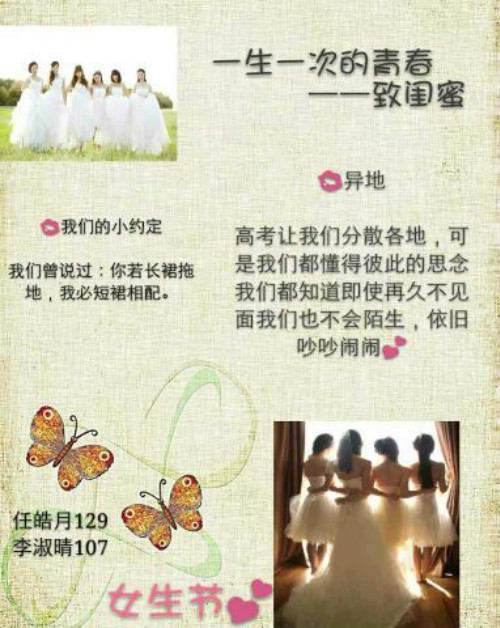 对于女生的祝福采用电子版海报的形式来体现,海报的内容可以是闺蜜间的密语、好友间的温情、朋友间的关爱。通过海报,同学们将平时说不出口的话表达了出来,加深了朋友间的感情。海报内容感情真挚,积极向上,体现出了同学之间的温馨情谊。活动后期,由于报名人数众多,所以经过几天筛选,选出的优秀作品将在365上市公司微信平台上进行展示,届时便于同学们观看。