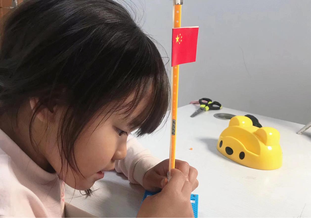 “熠熠生科”志愿服务团队提前录制视频,向小朋友们讲述国旗的历史、内涵和升旗礼仪、规范等内容。屏幕上鲜艳的五星红旗伴着雄壮的国歌缓缓升起,小朋友们庄严伫立、庄重敬礼、高唱国歌,抒发自己的爱国情怀,让鲜艳的五星红旗时刻飘扬在他们的心中。