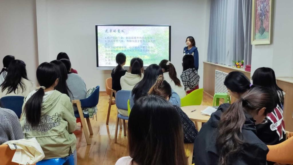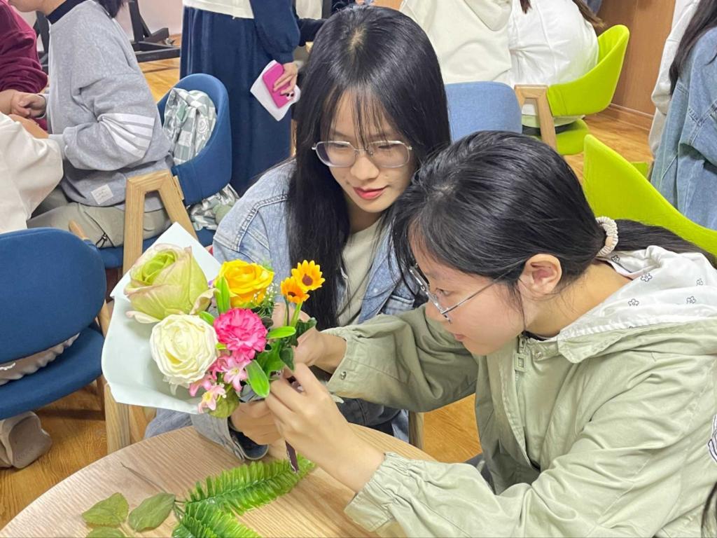 活动中,主讲人播放了“小王子的玫瑰花”故事视频引入主题,详细讲解了花束的制作方法并展示了优秀作品,引导同学们了解了花束的含义。随后,同学们利用志愿者分发的花材、彩色卡纸、丝带等材料满怀热情地动手实践,大家积极互动、探讨,在设计中融入自己的创意,制作出丰富多彩的花束作品,充满了大学生温暖的情感和艺术气息。最后,各小组进行作品展示并讲解创作理念。