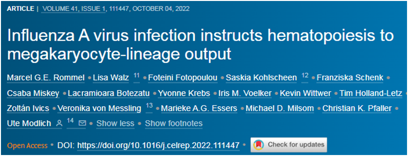 为了澄清血小板如何能够如此迅速地产生,这些作者仔细观察了活化的造血干细胞的表型,发现造血干细胞的一个亚群已经带有血小板前体细胞---巨核细胞(megakaryocyte)---的典型标志物。具有这种表面表型的造血干细胞直接分化为巨核细胞,并产生血小板。它们跳过了之前的几个阶段。他们通过体外谱系追踪和骨髓移植证实这个造血干细胞亚群在流感病毒感染后在骨髓中迅速增殖。这些新产生的血小板比普通血小板更大,外观更不成熟,而且往往更迅速地激活,这可能导致肺部出现血栓的风险更高。