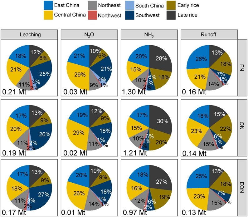 在中国三种氮管理策略下,基于区域的年度活性氮损失包括氮淋失、N2O排放、NH3挥发和氮径流。饼形图下的值是这四种损失途径中基于区域的活性氮损失。图片来自Nature, 2023, doi:10.1038/s41586-022-05678-x。