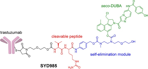 SYD985(trastuzumab duocarmazine)是Byondis利用其专有的基于duocarmazine的linker-drug技术平台ByonZine®开发的新一代HER2 ADC,由曲妥珠单抗和可切割的linker-drug缬氨酸-瓜氨酸-seco-DUocarmycin-hydroxyBenzamide-Azaindole(vc-seco-DUBA)组成。