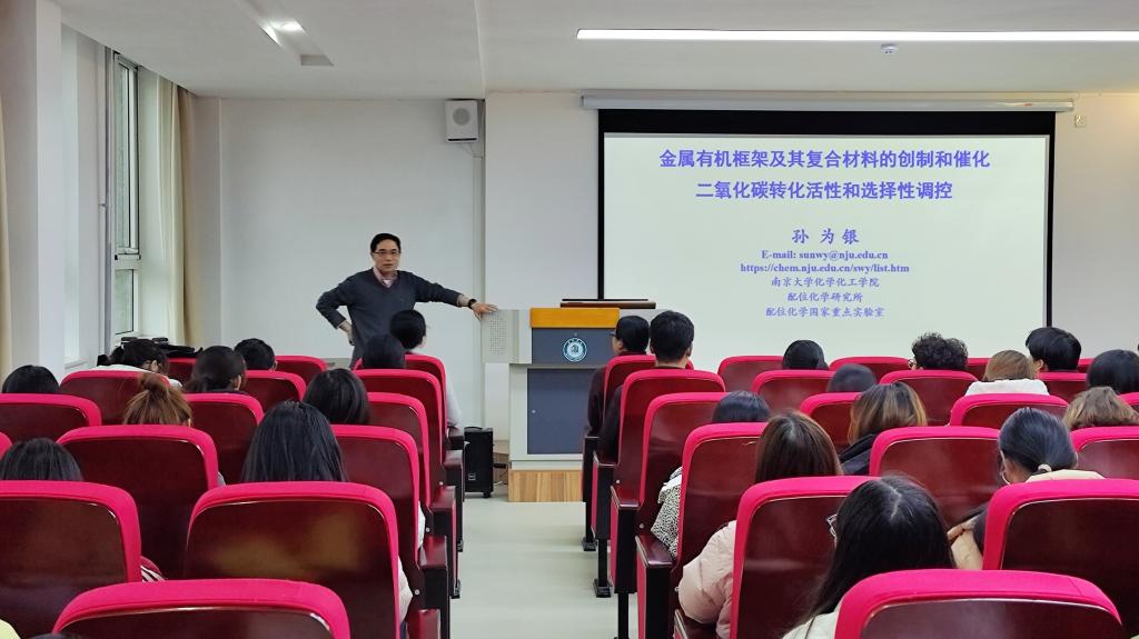 报告会上,孙为银教授结合自己及团队多年研究成果,为大家做了题为《金属有机框架及其复合材料的创制和催化 二氧化碳转化活性和选择性调控》的报告,他深入浅出地为同学们讲解了配位化学的相关知识,介绍了团队成员关于MOFs与CO转化的光催化及电催化方式的研究项目。在提问环节,参加讲座的老师和同学积极与孙为银教授进行面对面探讨,孙教授耐心解答,并鼓励大家在今后的科研过程中能够发扬勇于探索、不屈不挠的精神。