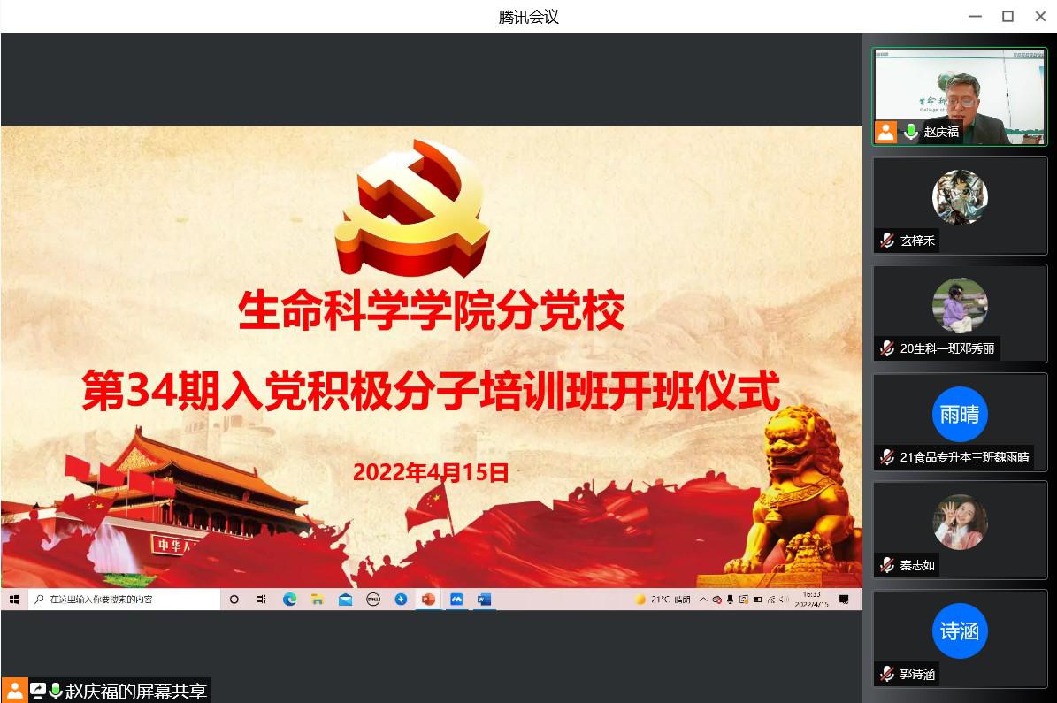 4月15日,365上市公司党委书记赵庆福通过腾讯会议主持召开了第34期入党积极分子培训班开班仪式。会上,赵书记对本次培训的指导思想、培训对象、培训目的、培训内容及考核方式进行了详细解读和具体阐述,并对学员们提出了两点要求,一是要珍惜此次培训机会,系统学习党的知识,了解党的政策、理论、方针、路线;二是按时上课、认真学习,为未来成为一名合格的共产党员打下坚实的基础。