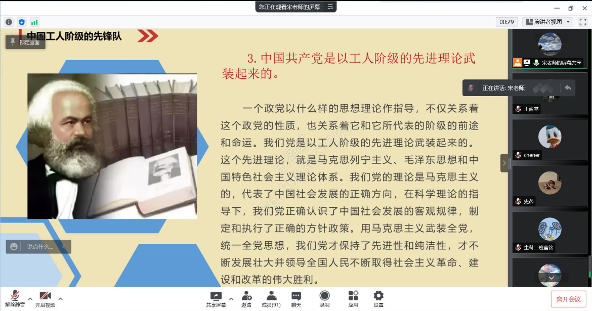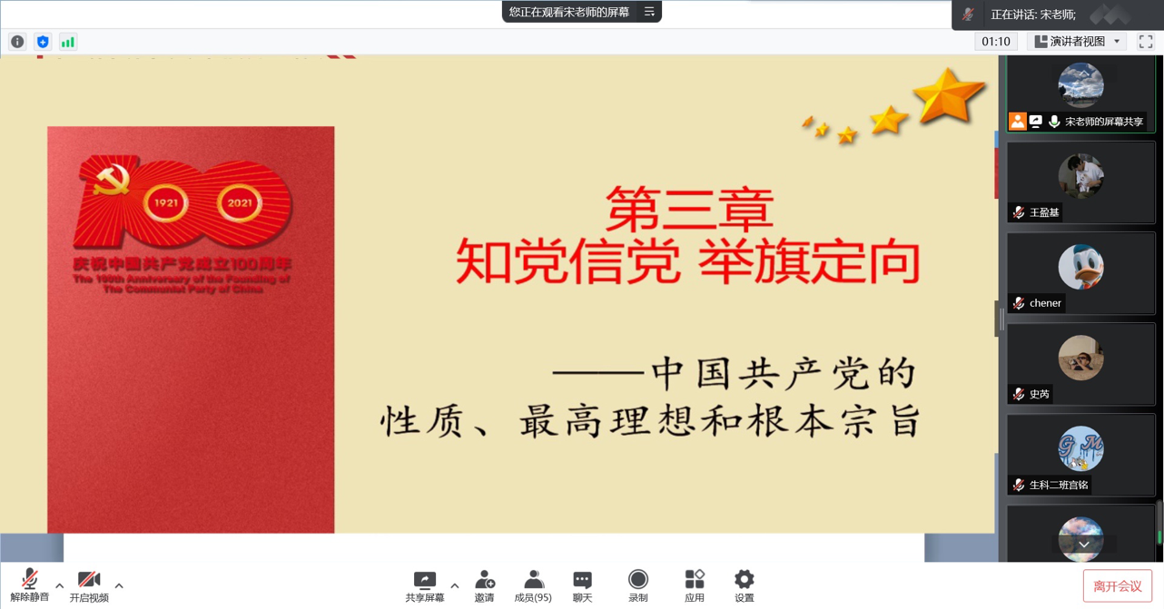在课程中,宋院长从中国共产党是以工人阶级为阶级基础,是由工人阶级的先进分子组成,是以工人阶级的先进理论武装起来的三个方面阐述了中国共产党的性质,从历史,现实,未来三个维度强调了中国共产党的核心领导地位。宋院长表示青年大学生要明确自身努力方向,不断提升自己的思想觉悟,更好的汲取党的智慧和力量,争做共产主义的接班人。