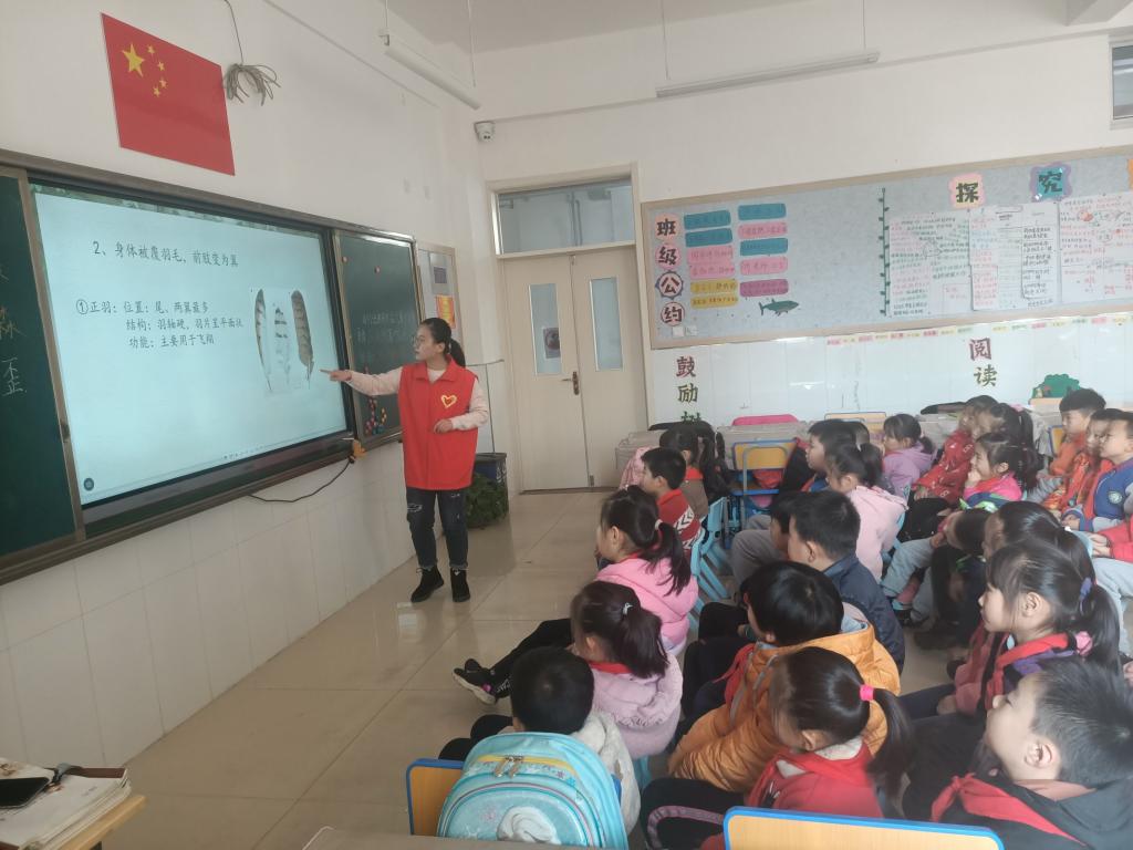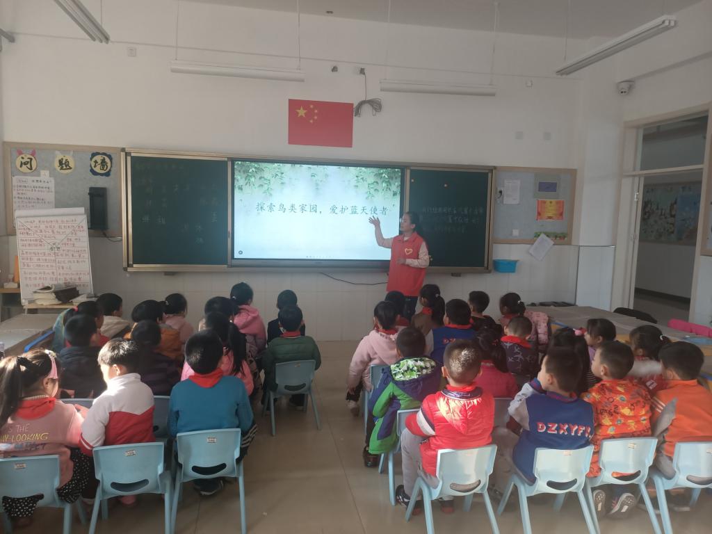 在课堂上,老师首先展示了几种鸟儿的视频,活灵活现的鸟儿激发了小朋友们的探索兴趣。随后老师让小朋友们结合亲身经历谈一谈对鸟儿的认识,小朋友们纷纷分享了自己和鸟儿之间的故事,老师结合这些故事讲解了有关鸟儿分类和鸟儿生活习性的专业知识。最后,志愿者老师展示了几种常见的鸟类图片,并询问小朋友们它们所属的种类,小朋友们纷纷开动脑筋,一番思考讨论后,给出了正确答案。