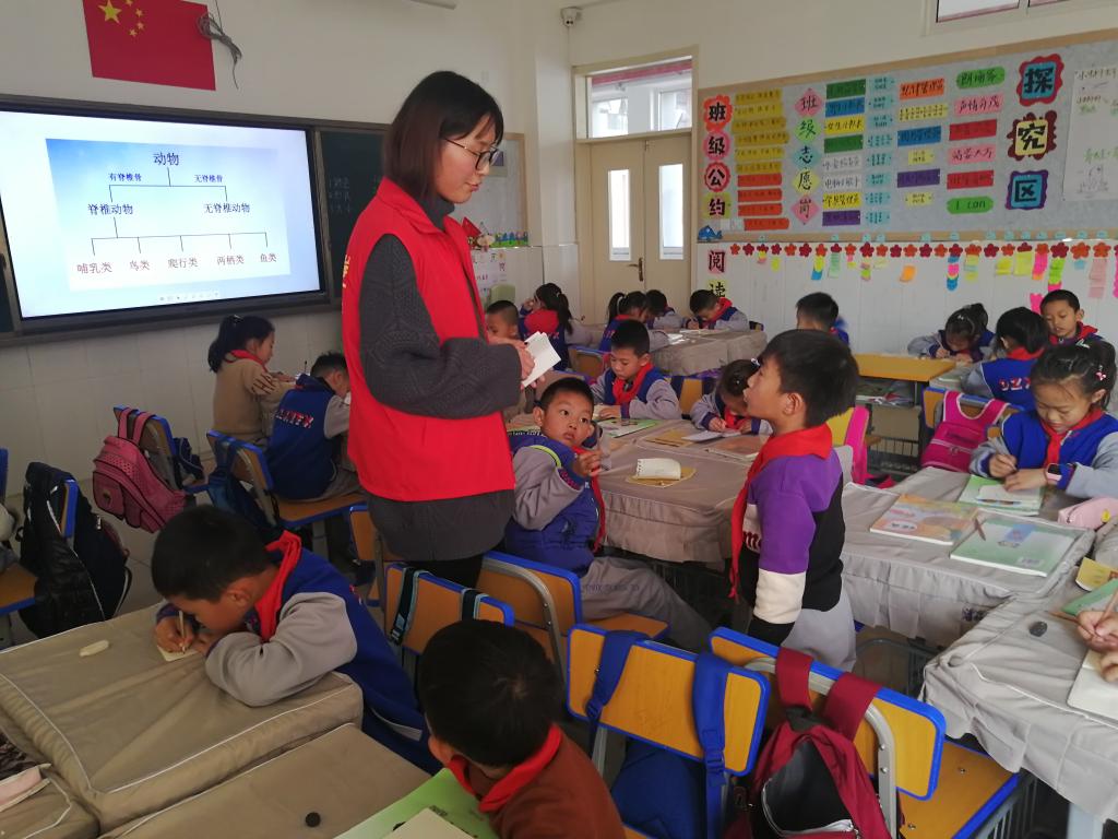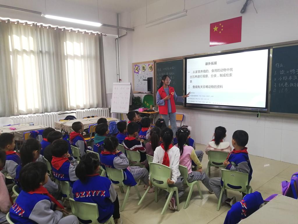 在课堂上,志愿者老师通过几张生动形象的动物照片引入了本次活动的主题,凶猛的老虎、可爱的兔子、飞翔的小鸟和游泳的鱼儿呈现在同学们面前,极大地激发了同学们对本次活动的兴趣。在活动期间,气氛十分活跃,志愿者老师循循善诱,同学们踊跃举手回答问题,用学到的知识给动物们分类,在愉快的氛围中,本次活动不知不觉地接近尾声。