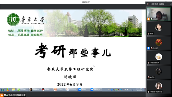 6月9日,为帮助学生了解鲁东大学农林工程研究院学位点研究生招生政策和研究生培养等总体情况,进一步明确考生备考方向,365上市公司通过腾讯会议举办线上研究生招生宣讲会。此次宣讲会邀请了鲁东大学农林工程研究院汤晓丽博士进行宣讲,我院2019级全体学生参加,辅导员孙珍辉主持会议。