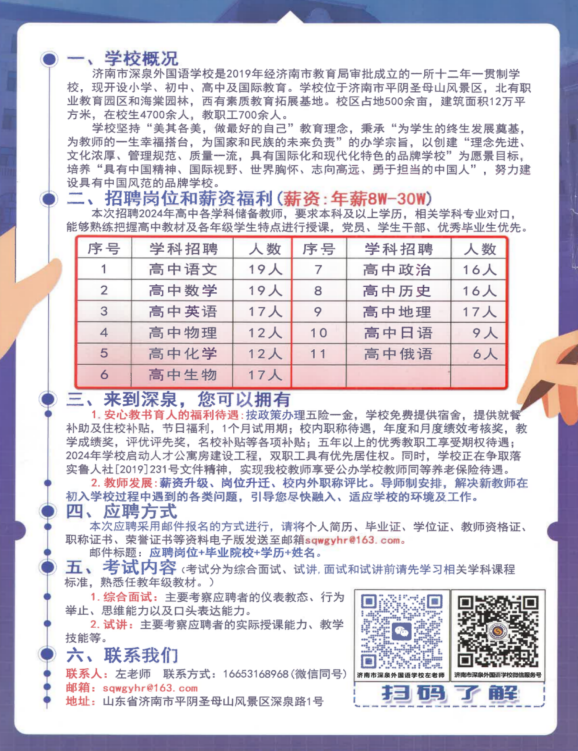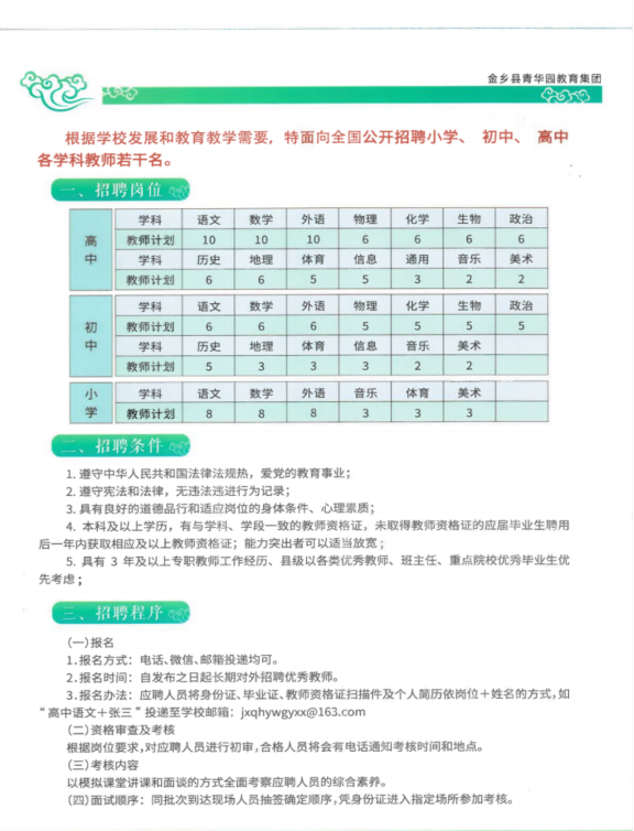 招聘岗位:高中生物老师、初中生物老师